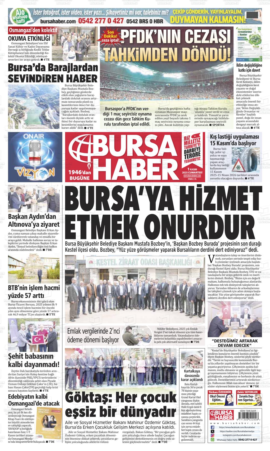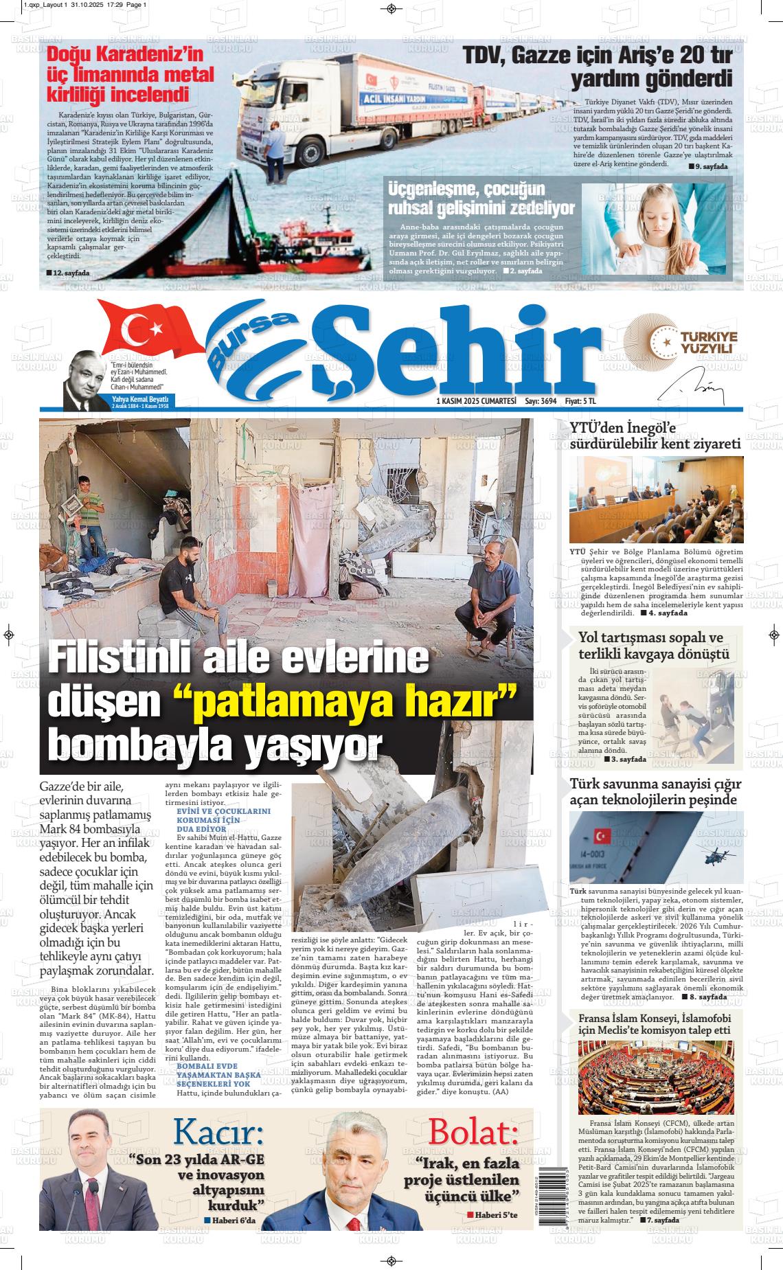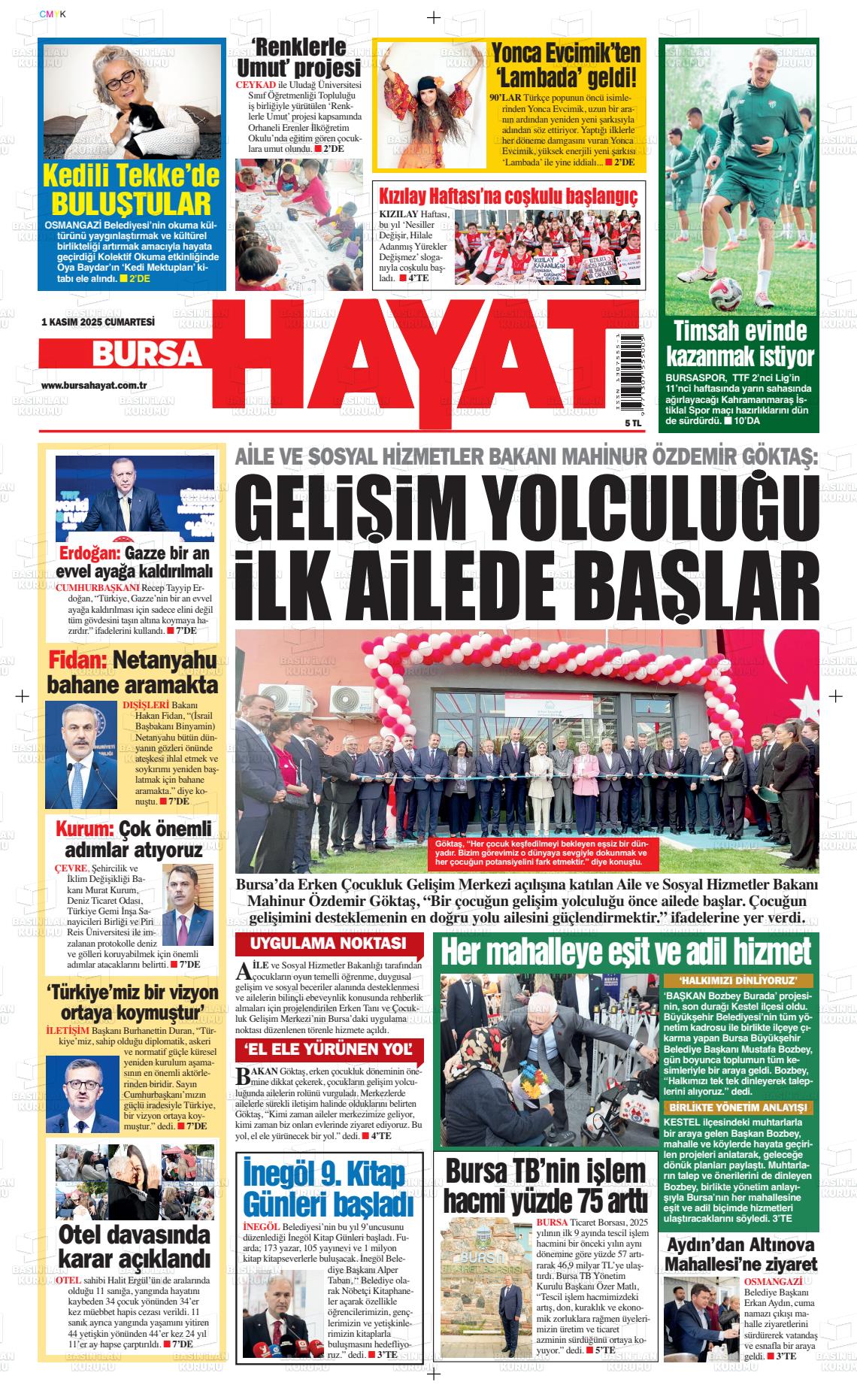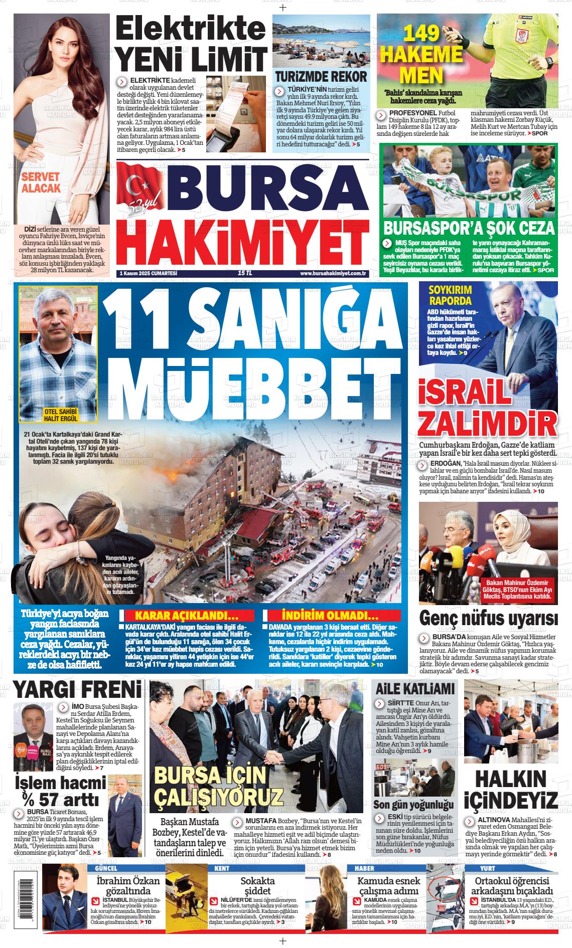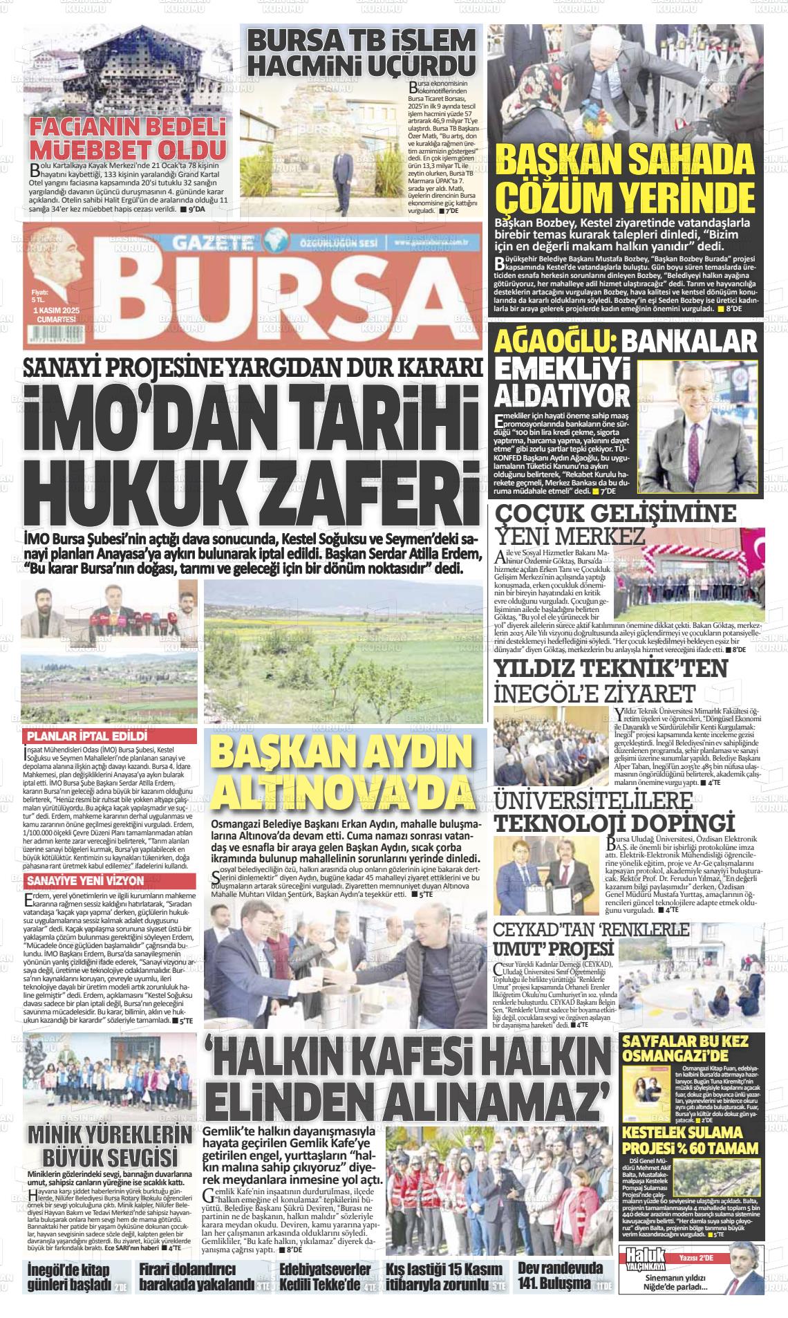 Bursa Yerel Gazeteleri 01 Kasım 2025, Cumartesi Günü Manşeti