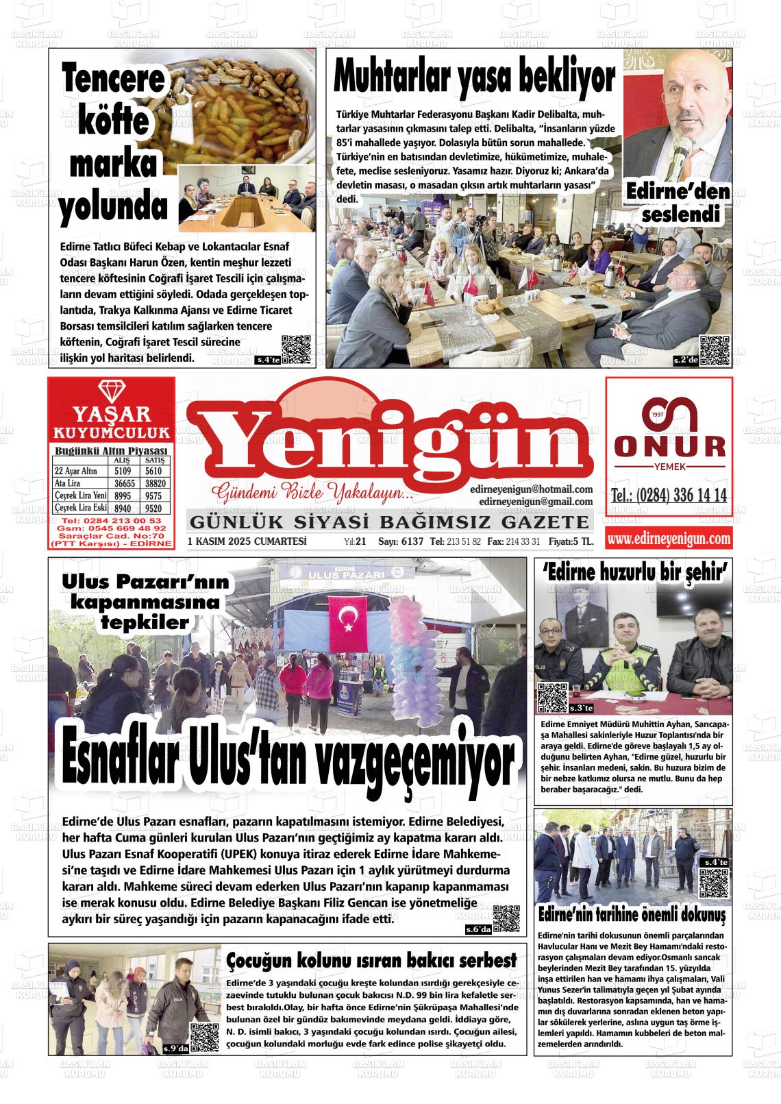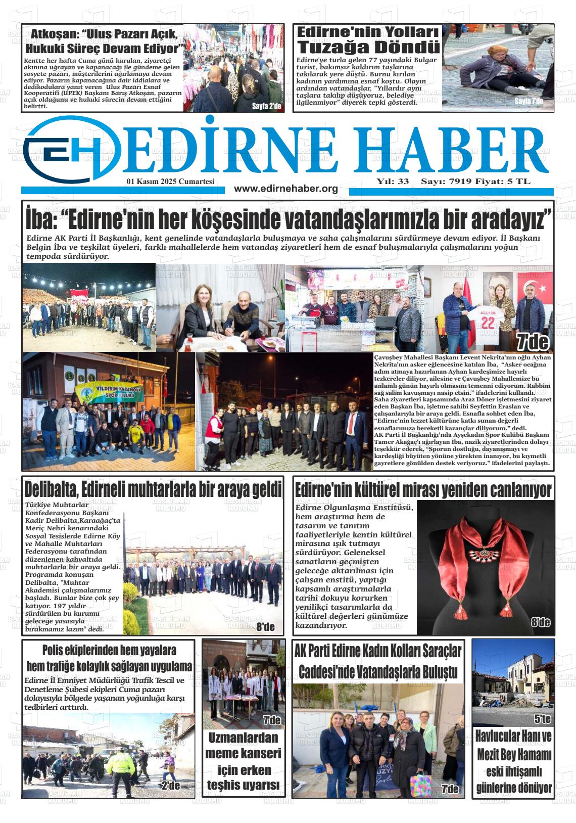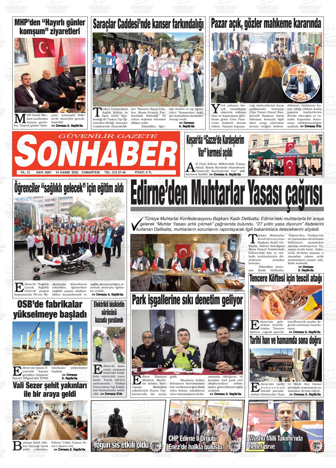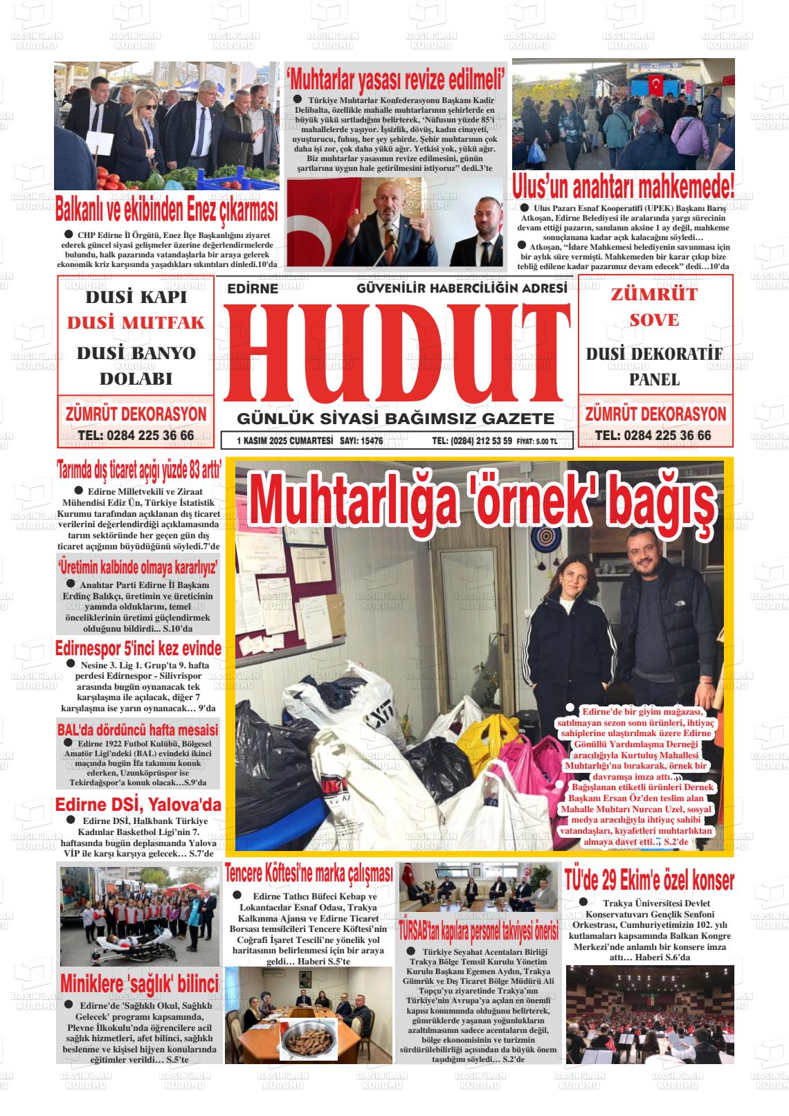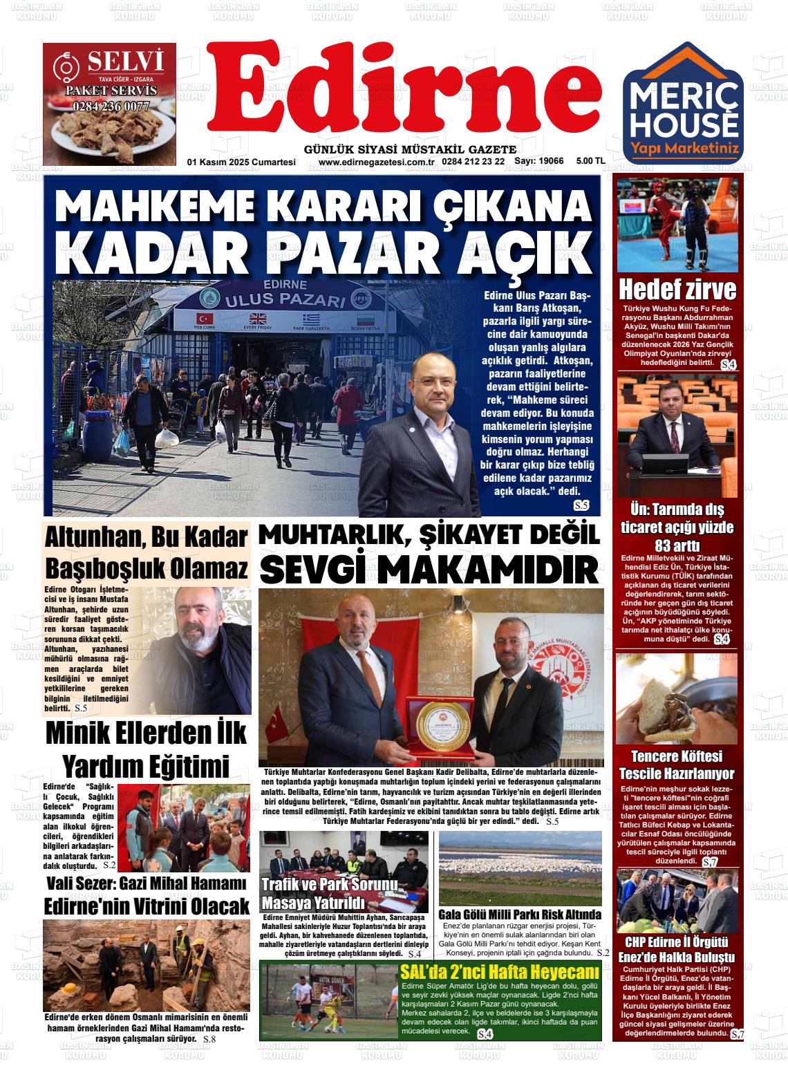 Edİrne Yerel Gazeteleri 01 Kasım 2025, Cumartesi Günü Manşeti