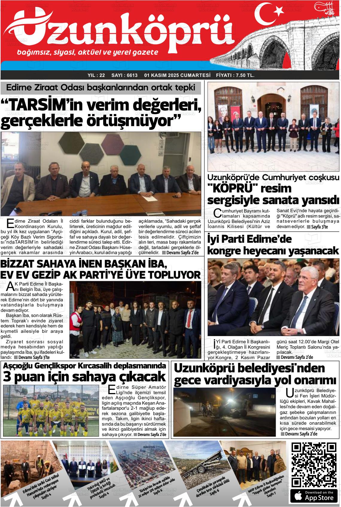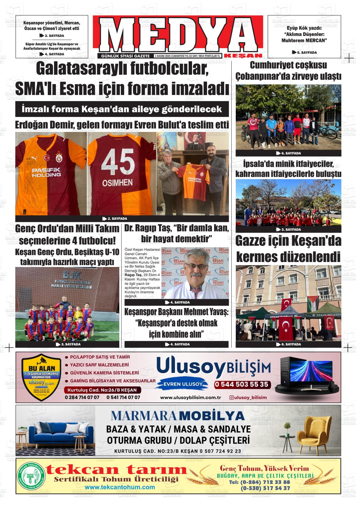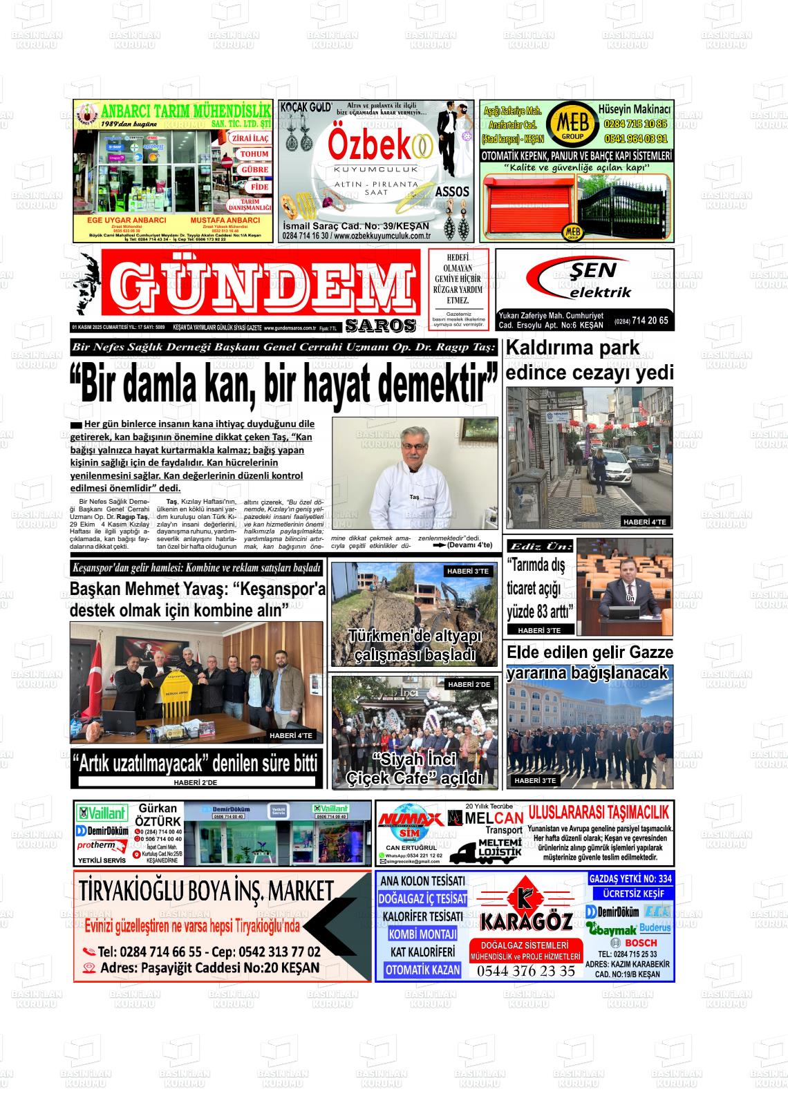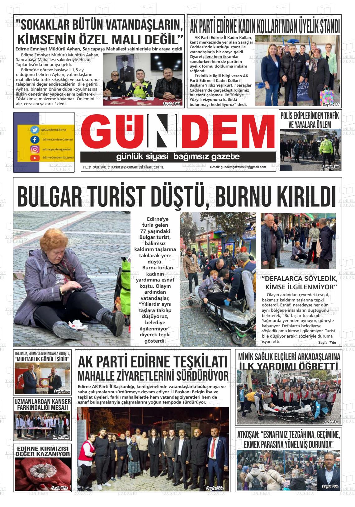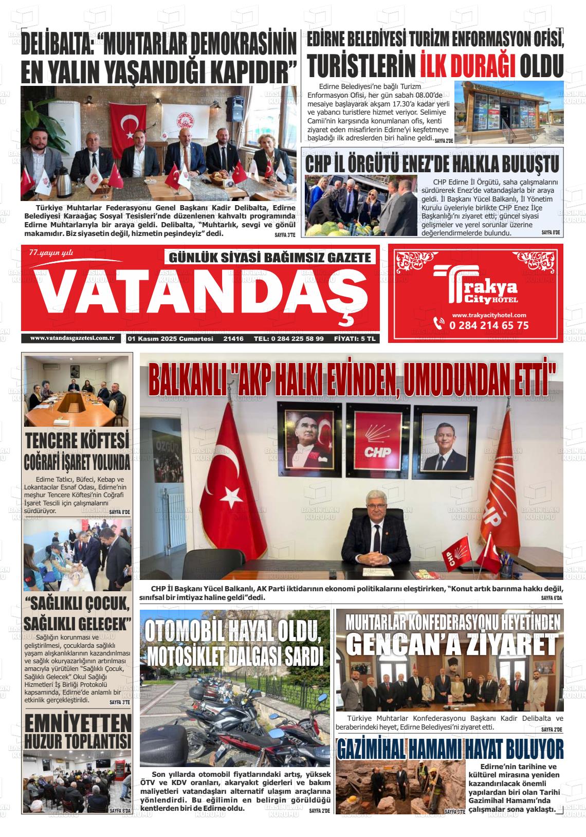Edİrne Yerel Gazeteleri 01 Kasım 2025, Cumartesi Günü Manşeti