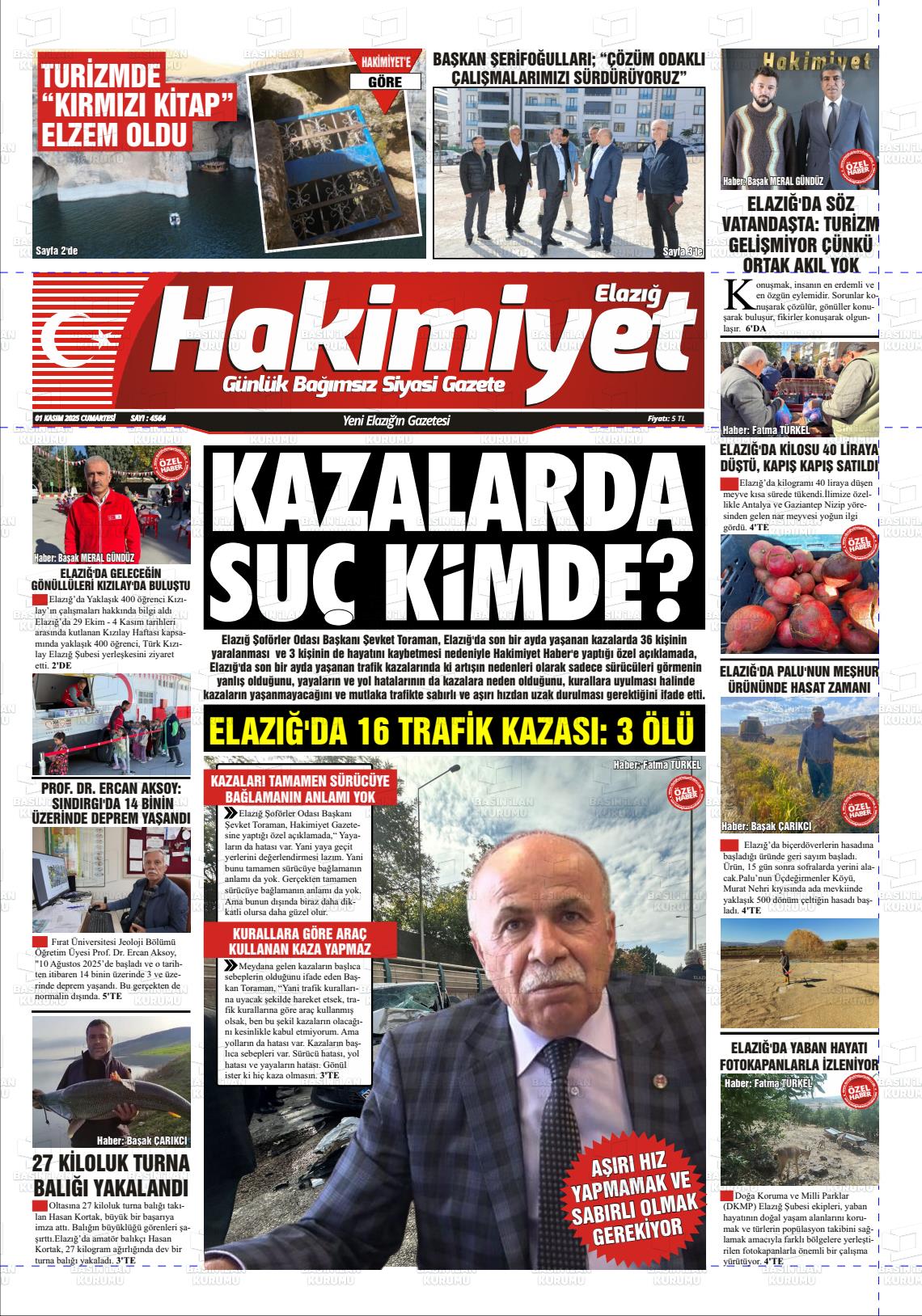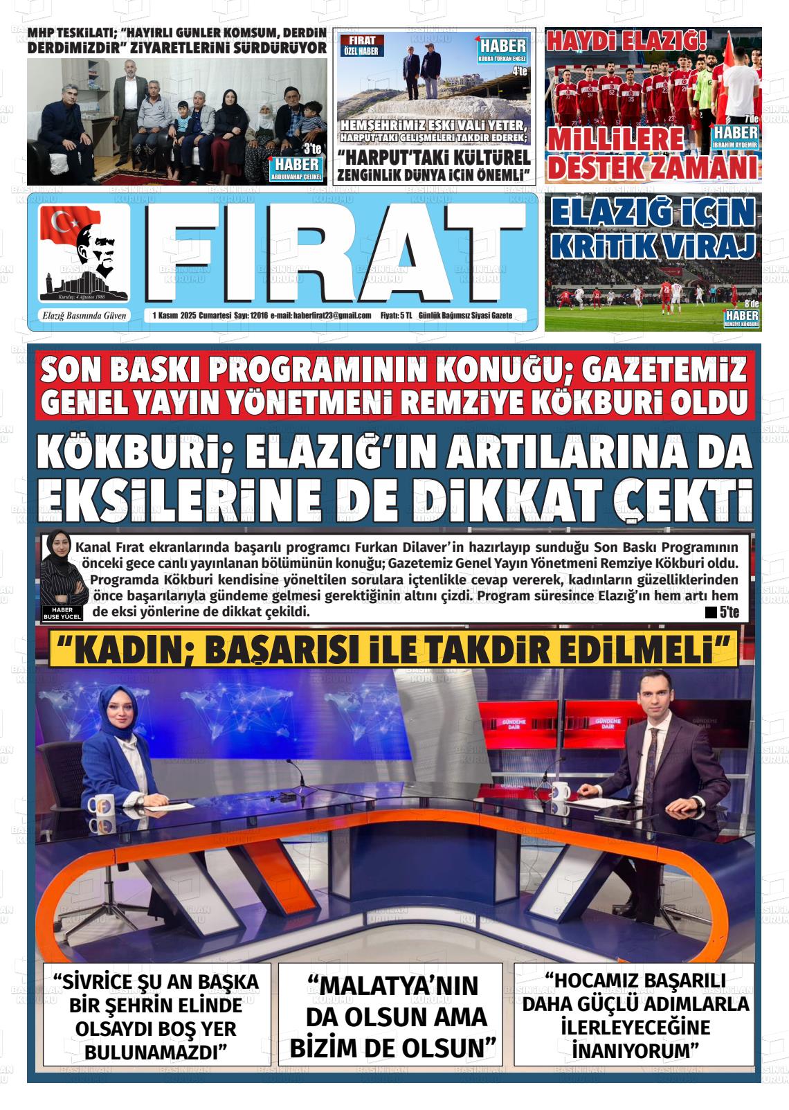 Elazığ Yerel Gazeteleri 02 Kasım 2025, Pazar Günü Manşeti