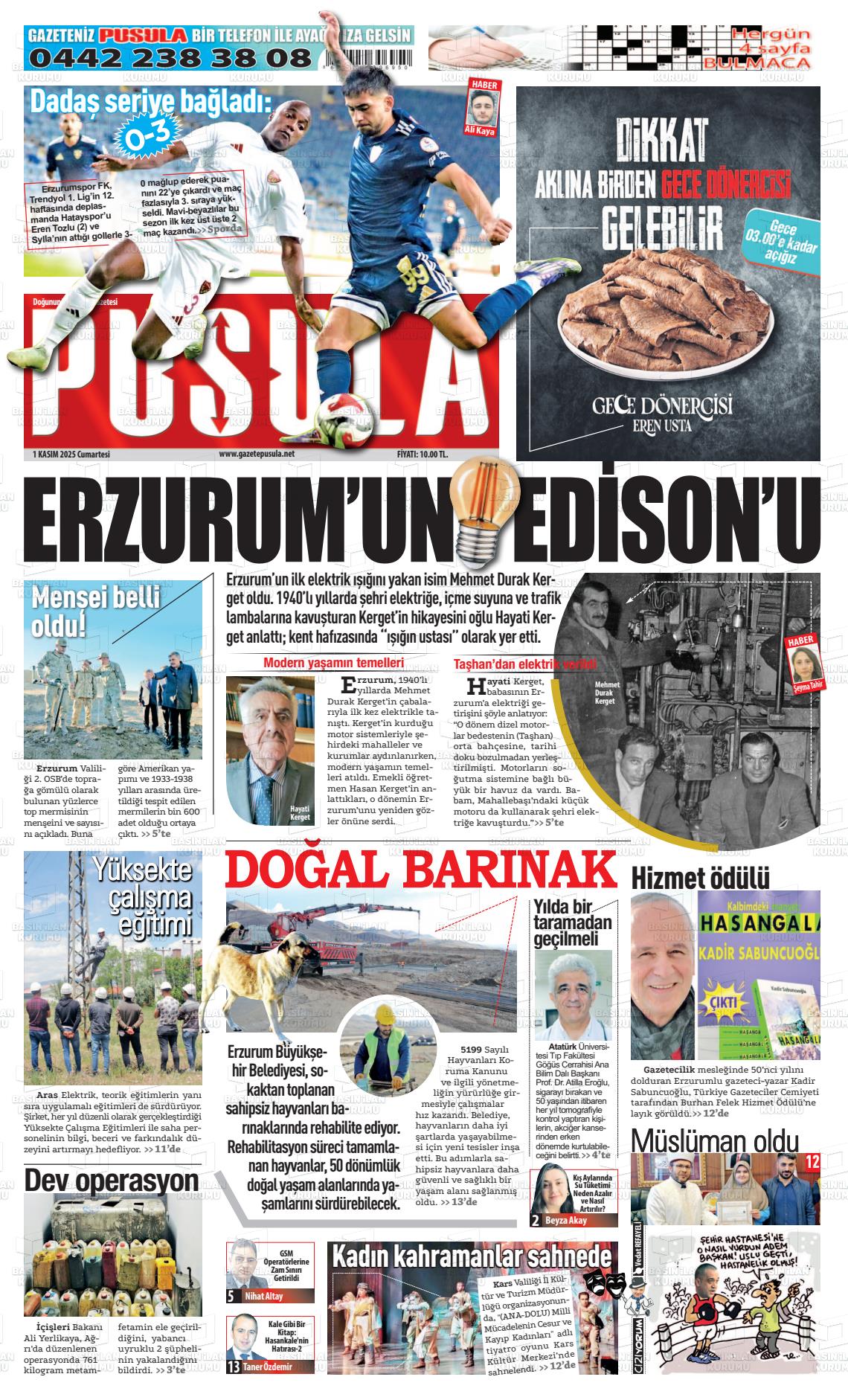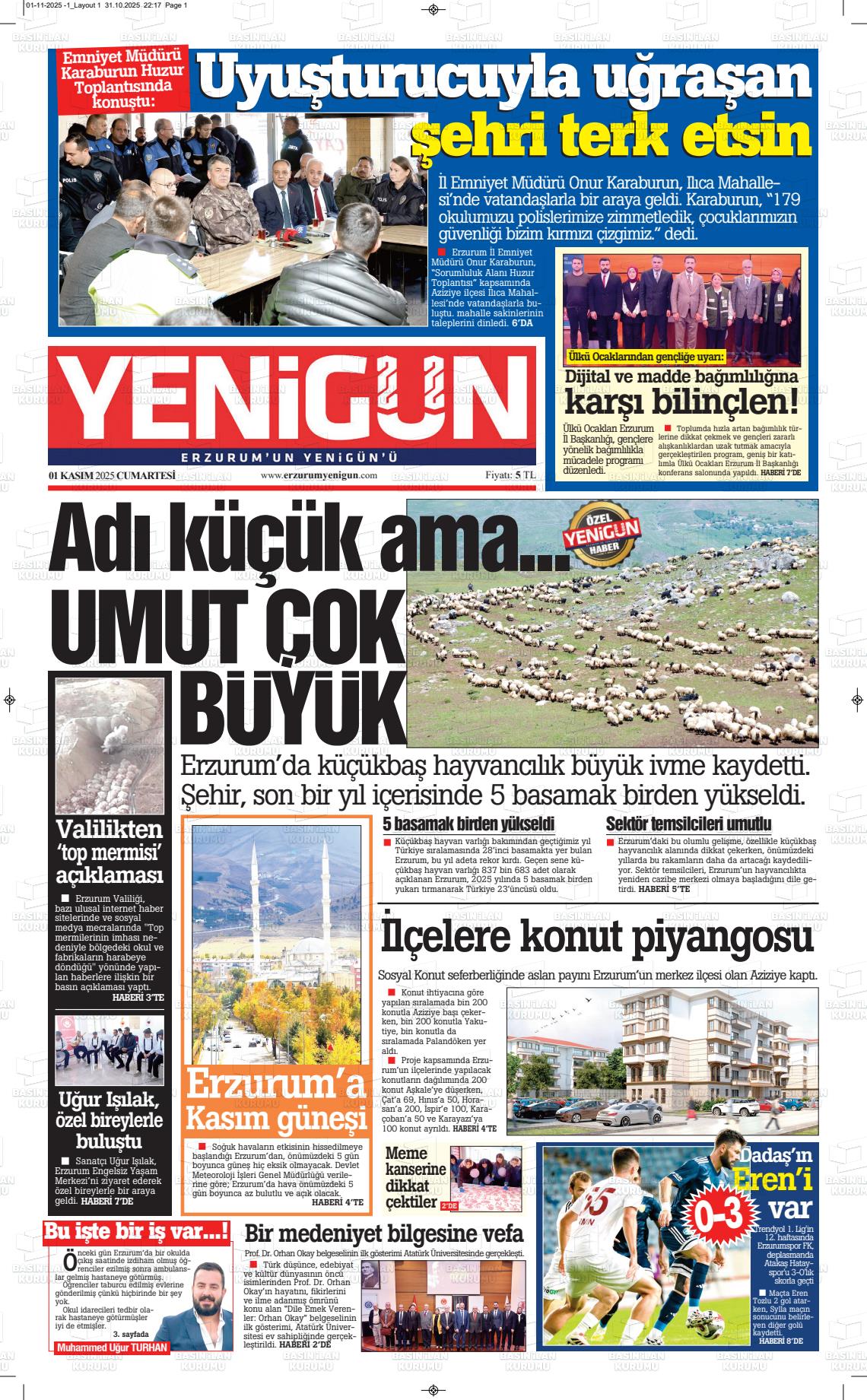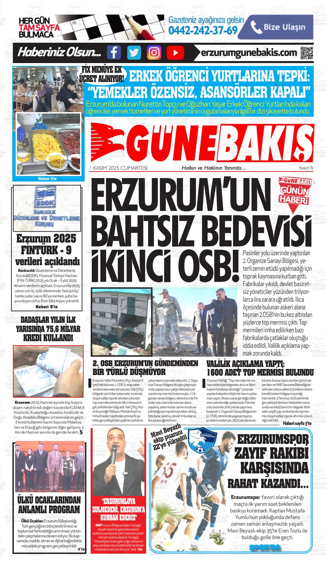 Erzurum Yerel Gazeteleri 01 Kasım 2025, Cumartesi Günü Manşeti