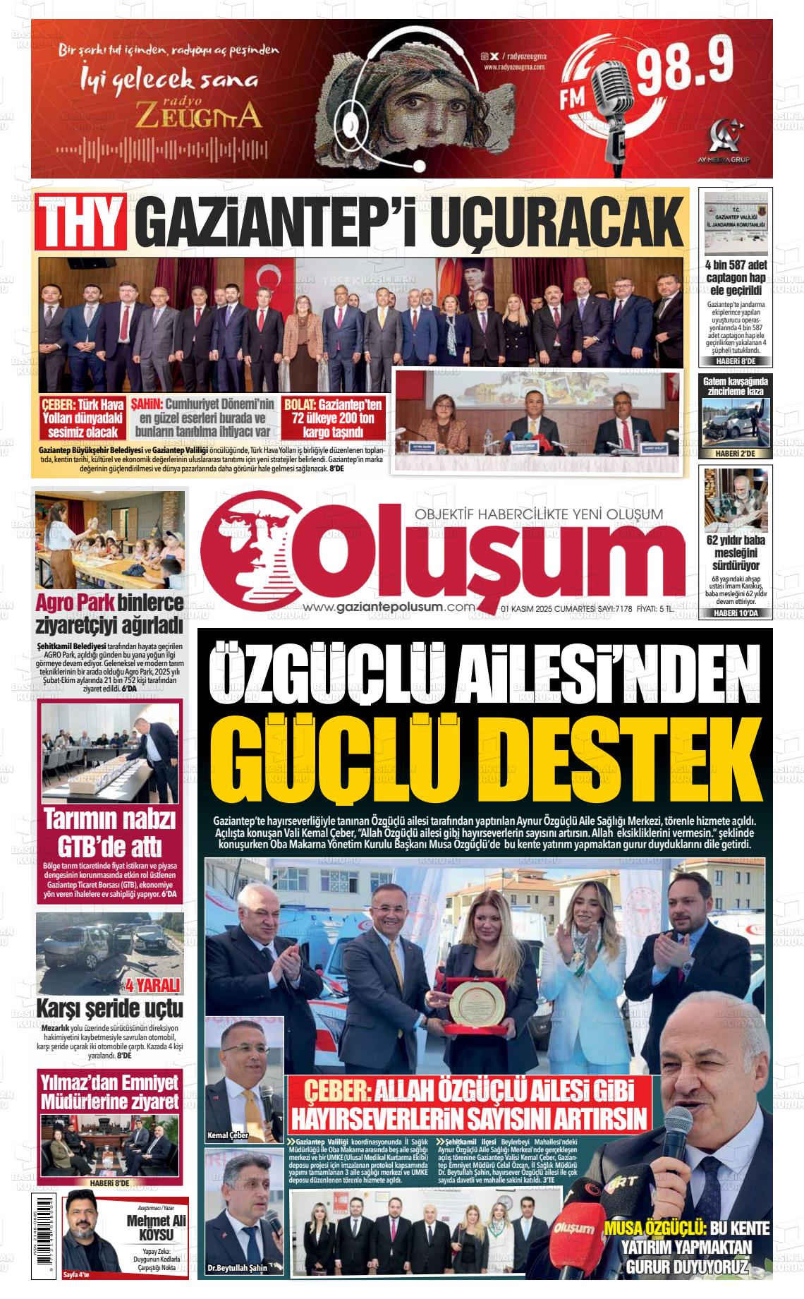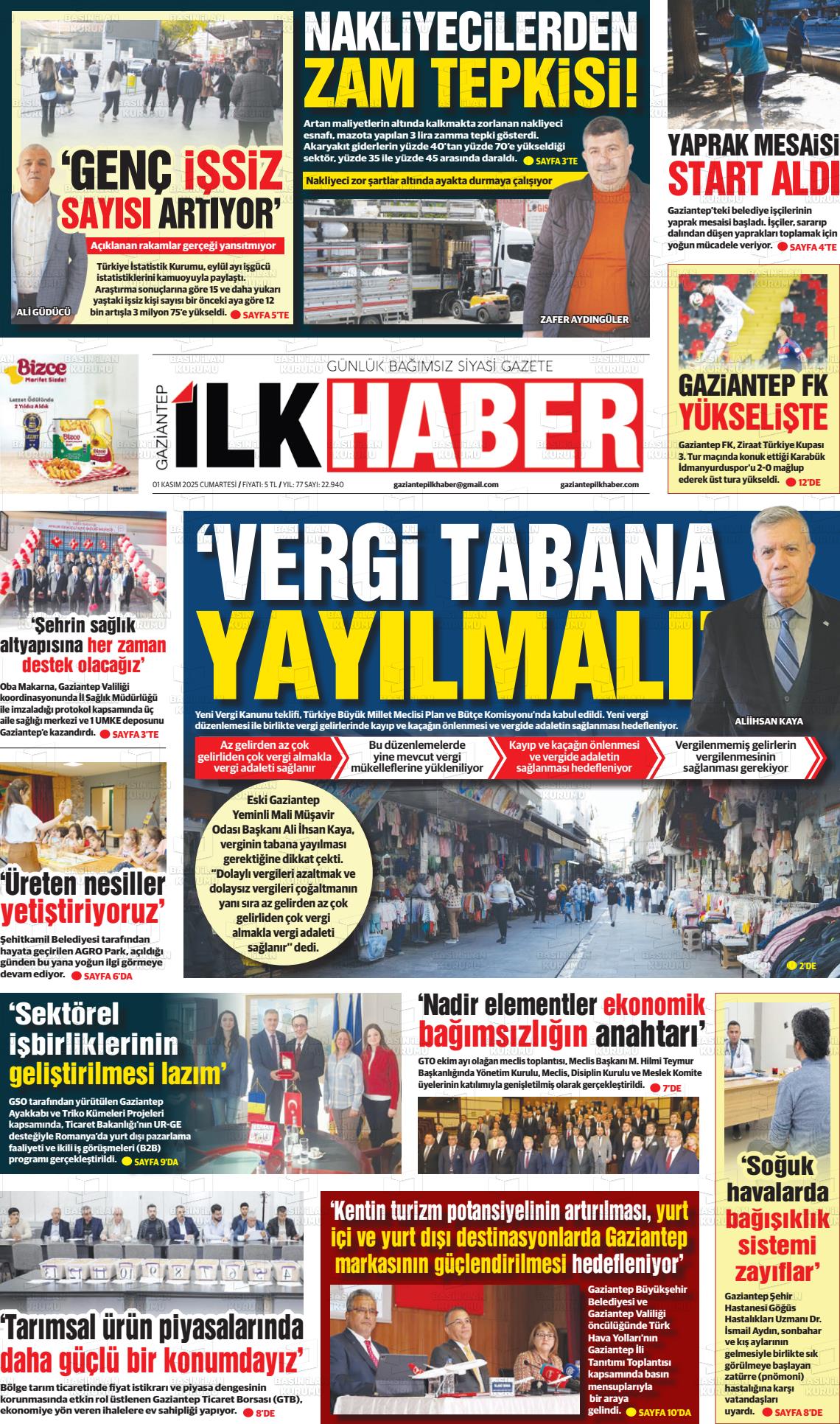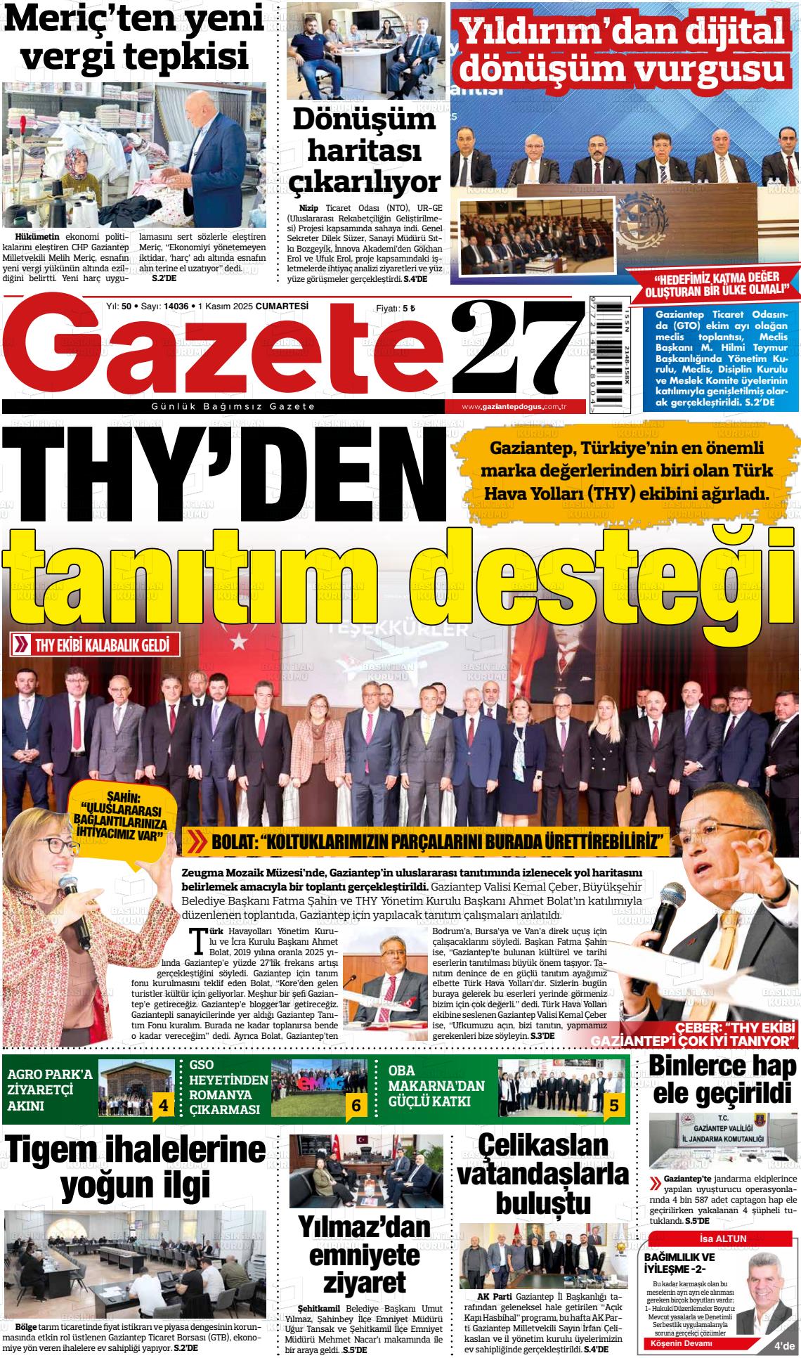 Gazİantep Yerel Gazeteleri 01 Kasım 2025, Cumartesi Günü Manşeti