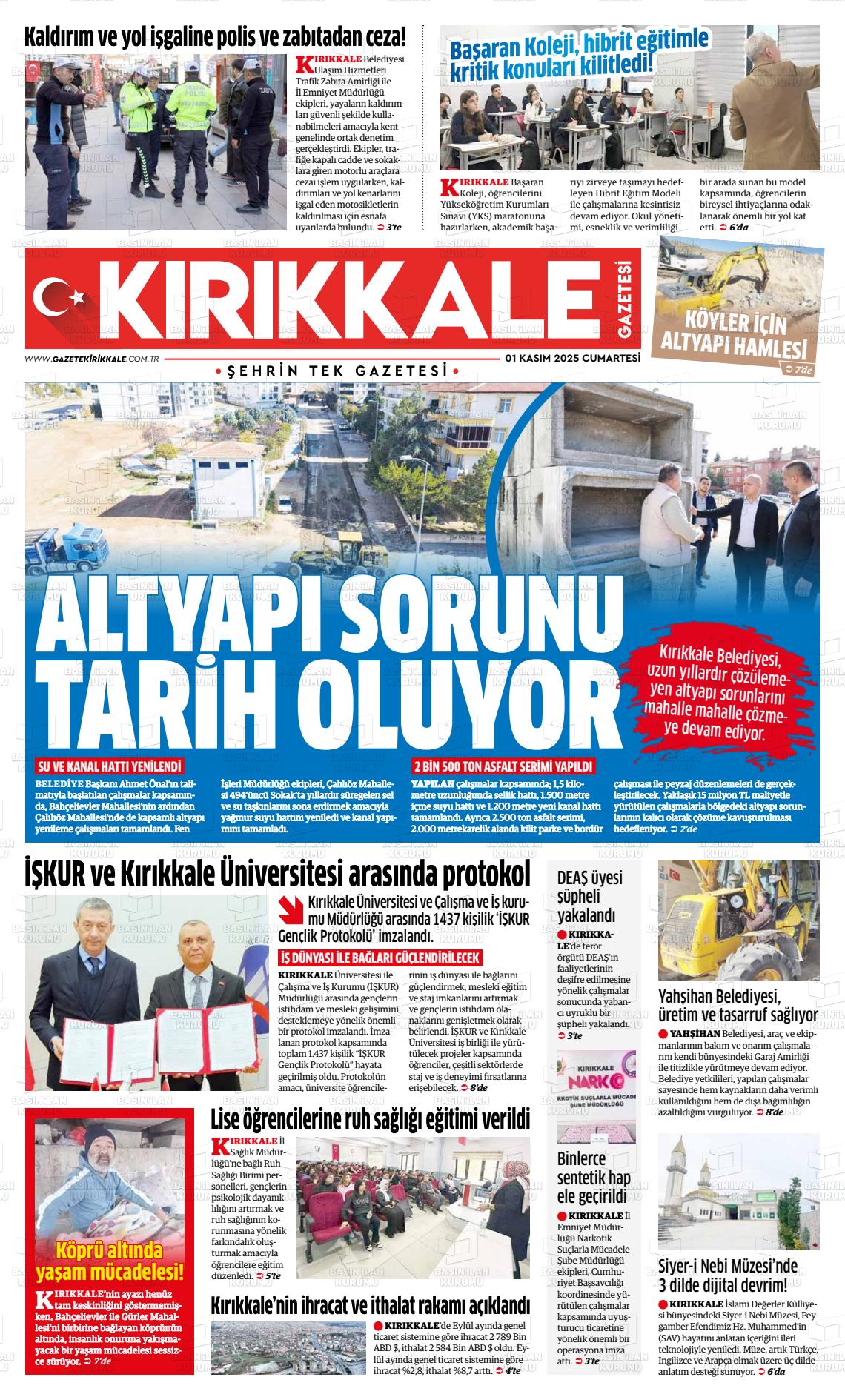 Kırıkkale Yerel Gazeteleri 01 Kasım 2025, Cumartesi Günü Manşeti