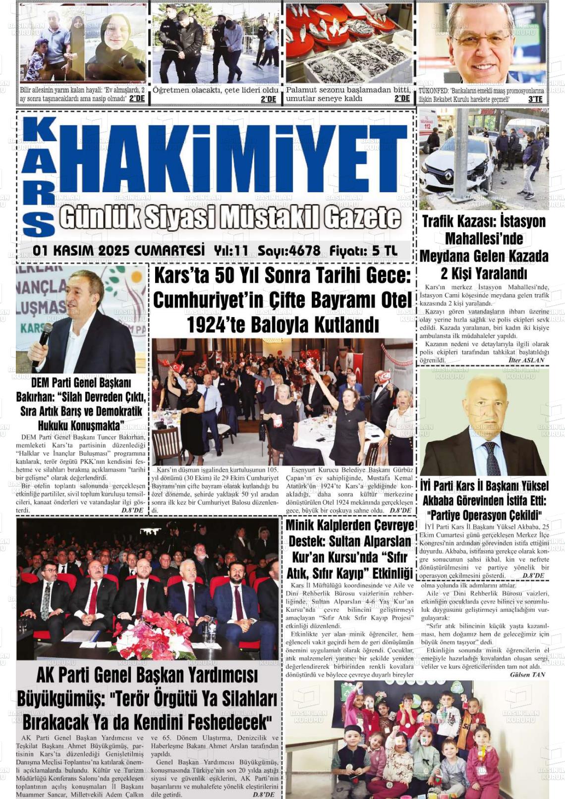 Kars Yerel Gazeteleri 01 Kasım 2025, Cumartesi Günü Manşeti