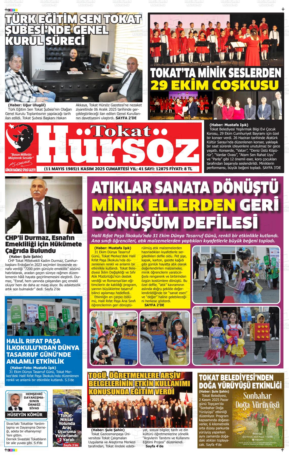 Tokat Yerel Gazeteleri 01 Kasım 2025, Cumartesi Günü Manşeti