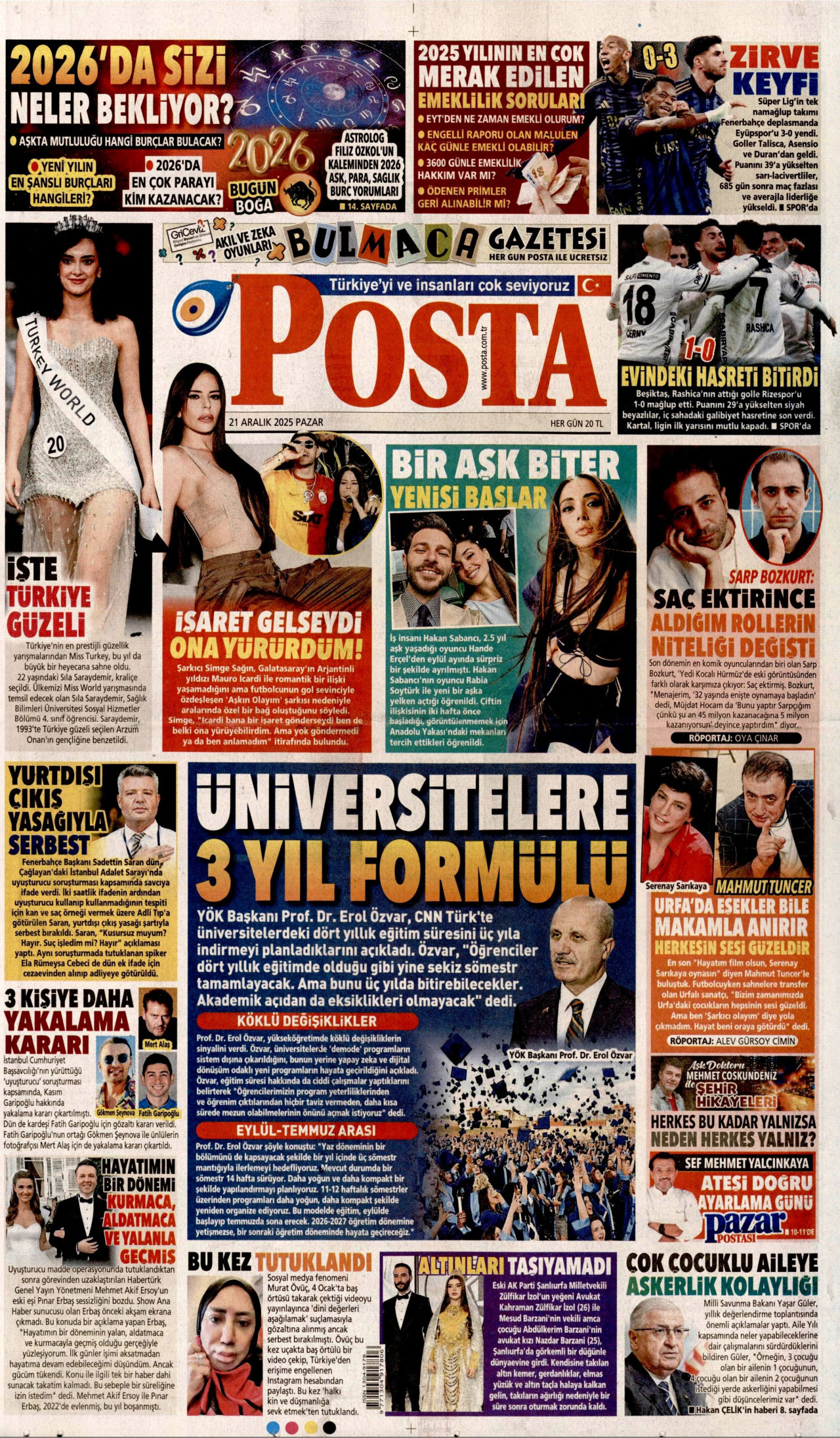POSTA Gazetesi 21 Aralık 2025, Pazar Günü Manşeti
